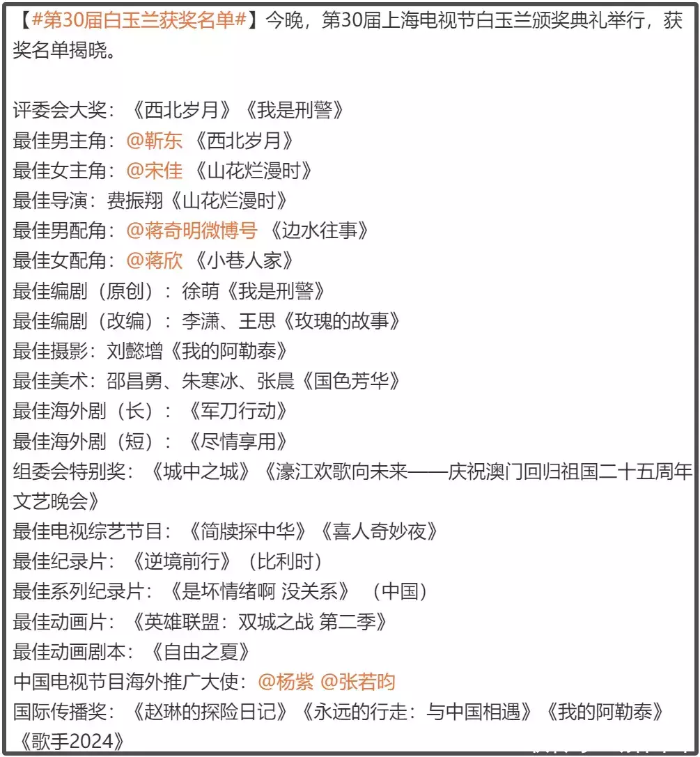 2025年白玉兰奖获奖名单出炉了!恭喜宋佳、靳东白玉兰奖成为新晋视后视帝——宋佳还是二封视后,而靳东是首次获奖。